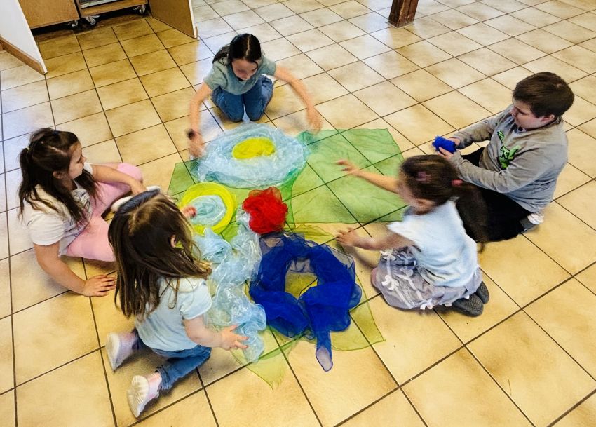 Am Freitag, dem 17. April 2026, stand das Kindertanzen ganz unter dem Motto „Endlich ist der Frühling da!“. Passend hierzu wurde mit bunten Tüchern zu frühlingshafter Musik getanzt und mit den Tüchern eine schöne bunte Blumenwiese gestaltet. Staunend und voller Freude ließen die Kinder ihre bunten Tücher immer wieder in neuen Kombinationen zu Blumen erblühen.